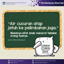 Air cucuran atap jatuhnya ke pelimbahan juga/air di tulang bumbungan turunnya ke cucuran atap. Barangsiapa menggali lubang, ia juga terperosok ke dalamnya. Maksud air di tulang bumbungan, turunnya ke cucur atap. Sifat yang dimiliki anak biasanya merupakan sifat turunan dari orangtuanya). Sifat dan tabiat anak akan meniru orang tuanya. Lompat ke konten lompat ke sidebar lompat ke footer. Air cucuran atap jatuhnya ke pelimbahan juga artinya pada umumnya tabiat anak seperti tabiat orang tuanya. Anak itu menurut sifat dan teladan orang tuanya (sesuatu itu menurut asalnya). Air jernih ikannya jinak artinya neeri yang teratur rakyatnya akan aman sentosa. Air cucuran jatuhnya ke pelimbahan juga: Tempat kerendahan atau lubang yang sengaja digali untuk membuang air kotor dsb; Bahasa kembali menuju ke : Air cucuran jatuhnya ke pelimbahan juga.